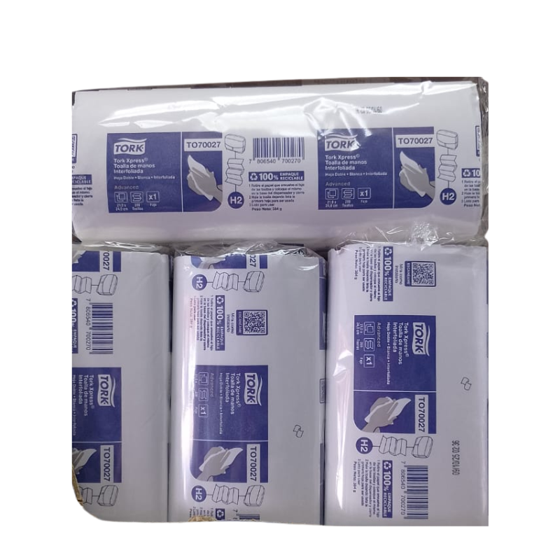 Paquete de toallas blancas interfoliadas, ideales para dispensadores.